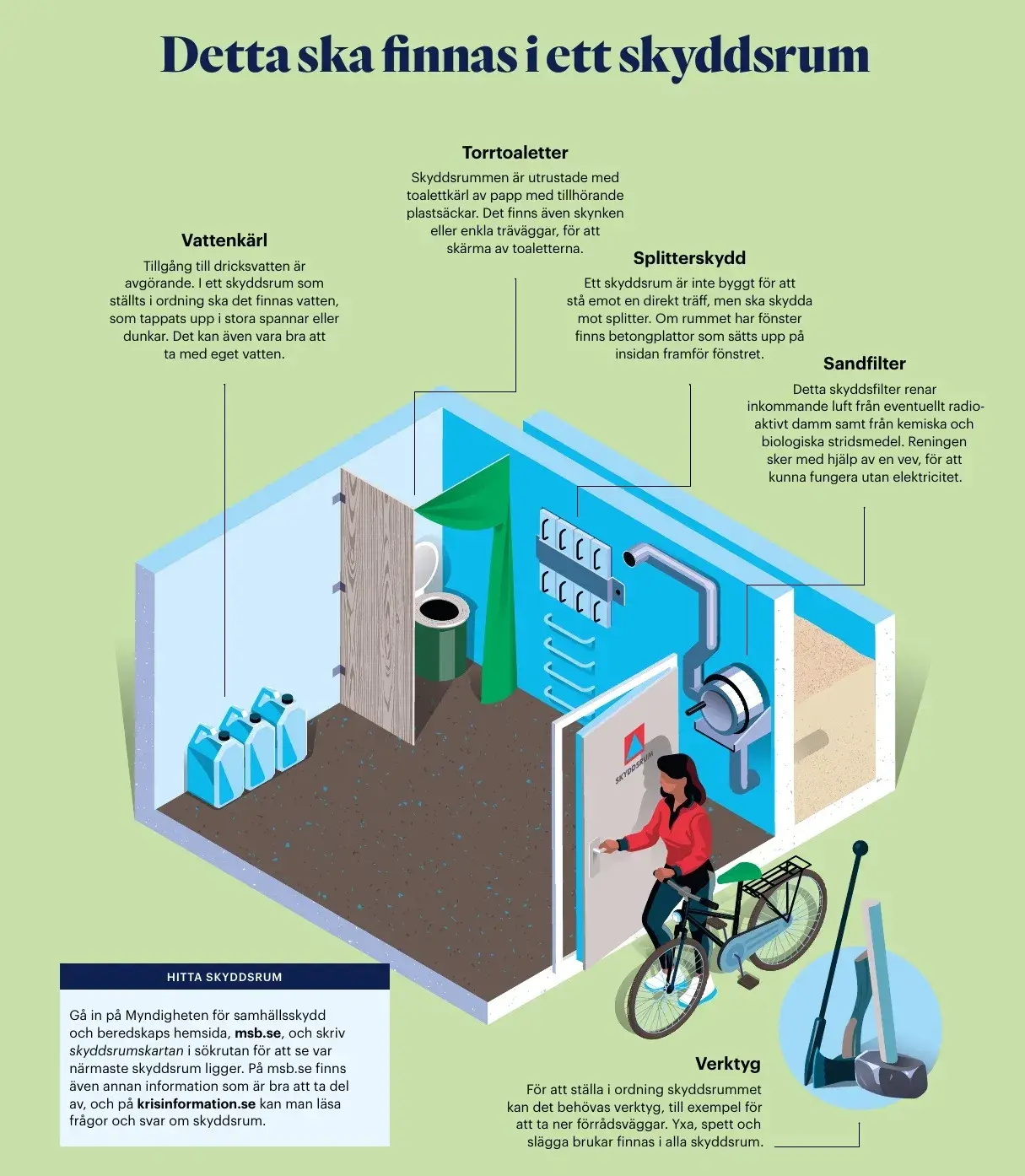 För att ställa i ordning skyddsrummet kan det behövas verktyg för att till exempel ta ner förrådsväggar. Yxa, spett och slägga brukar finnas i alla skyddsrum.